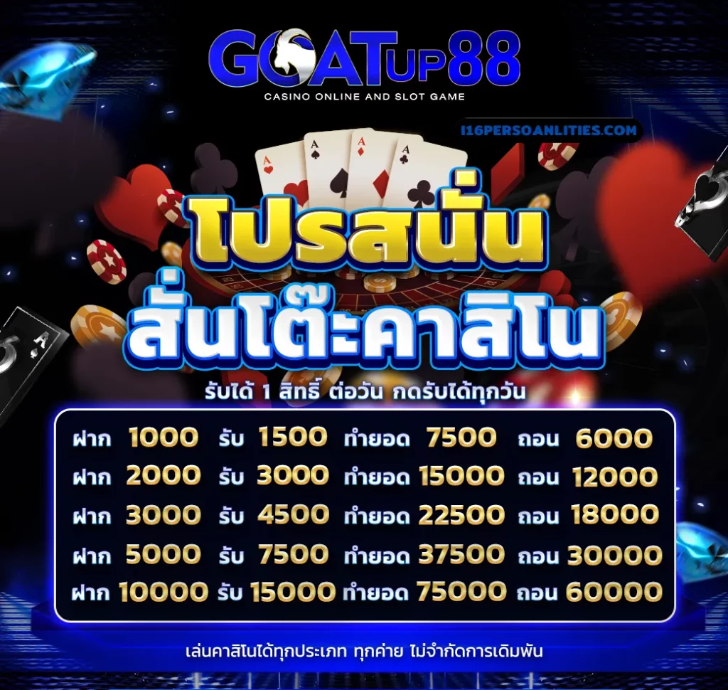 GoatUp88 นำเสนอบริการที่หลากหลาย รวมถึงระบบคาสิโนออนไลน์อัตโนมัติ เล่นได้ทุกช่องทางผ่านเว็บไซต์ เรามีแบรนด์ดังมากมาย อาทิ SA Game, Top Games, Asian Games, AE Sexy และ Sexy Baccarat ระบบหลังบ้านที่เสถียรของเรารับประกันว่าหากคุณพบปัญหาใดๆ เกี่ยวกับคาสิโนออนไลน์หรือพบข้อผิดพลาดใดๆ คุณสามารถรายงานปัญหาดังกล่าวกับพนักงานของเราได้ผ่านช่องทางใดก็ได้ GoatBet มีโปรโมชั่นมากมายบนเว็บไซต์ของเรา ไม่ว่าจะเป็นโปรโมชั่นสำหรับสมาชิกใหม่ โปรโมชั่นเดิมพันต่ำ ค่าคอมมิชชั่นสำหรับการแนะนำ และข้อเสนอพิเศษอื่นๆ อีกมากมาย รับรองว่าคุณจะเพลิดเพลินไปกับความสนุกอย่างเต็มที่